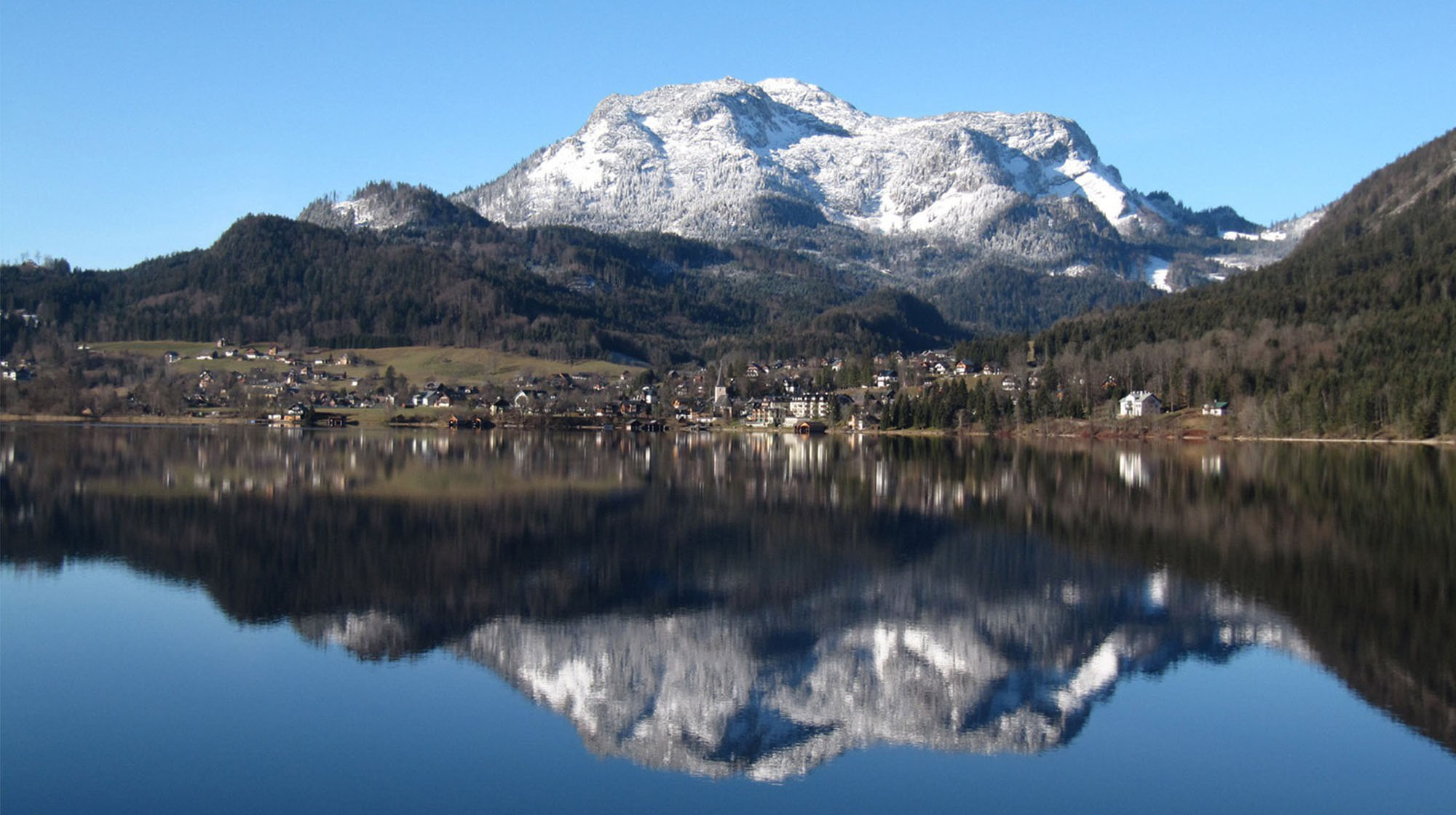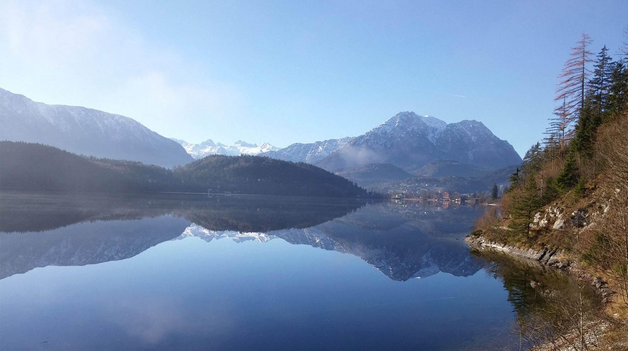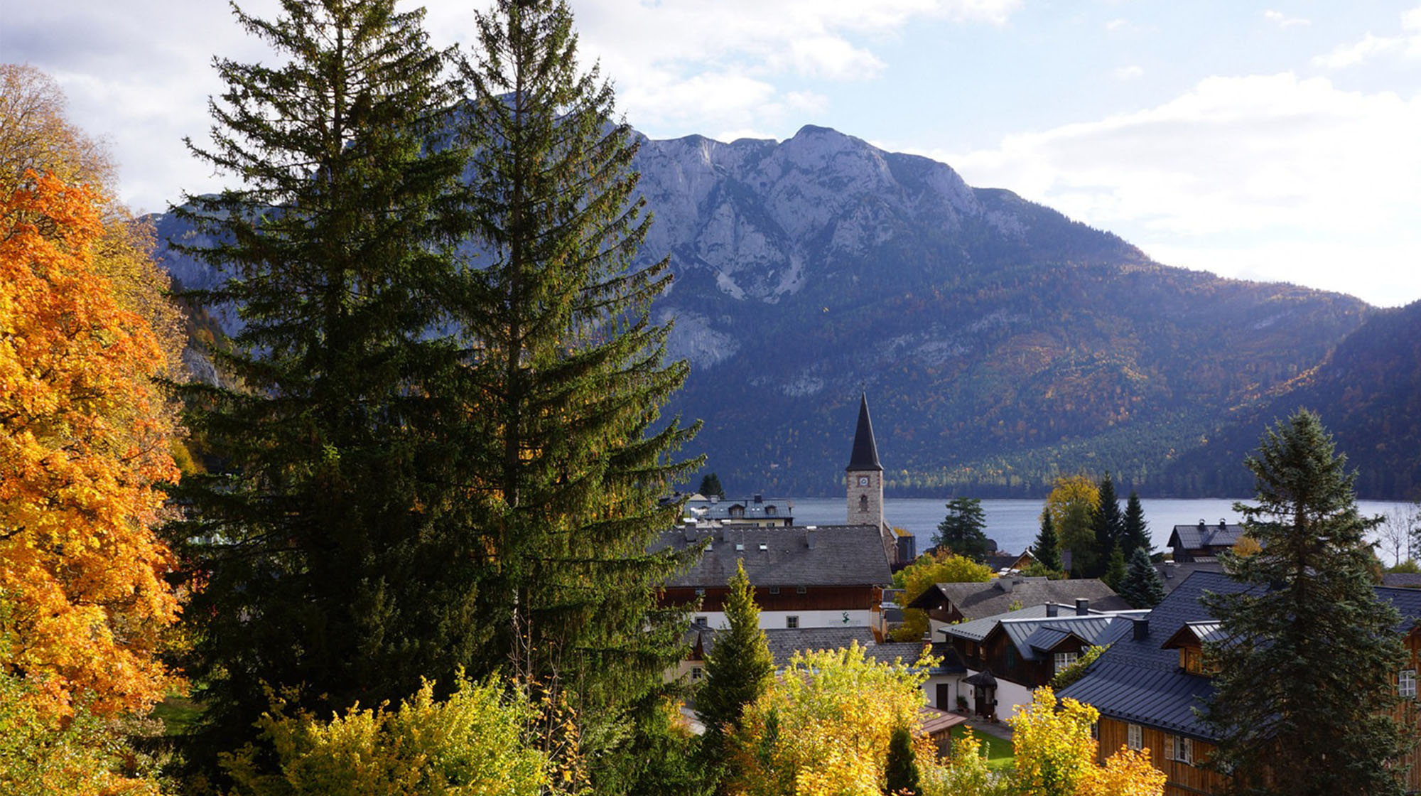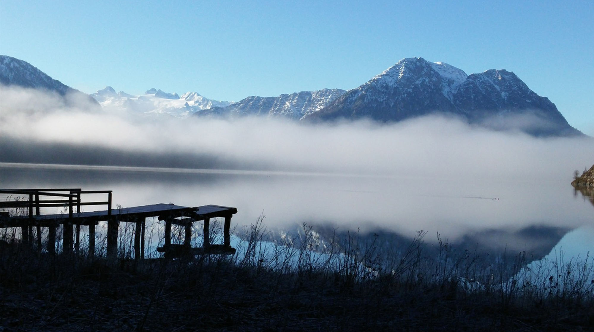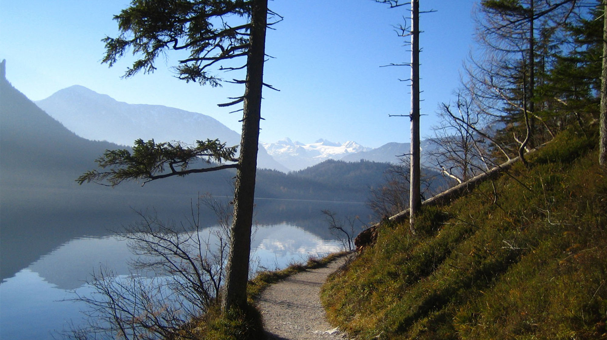 Die Morgensonne beleuchtet unsere bezaubernde Landschaft. Loser, Trisselwand, Zinken, Sarstein, Dachstein und Sandling faszinieren durch ihre Schönheit und grüßen im Licht des aufgehenden Tages. Der zum Greifen naheliegende See noch dunkel, der unverbaute ebene Uferweg lädt bereits frühmorgens zu einem Spaziergang ein.